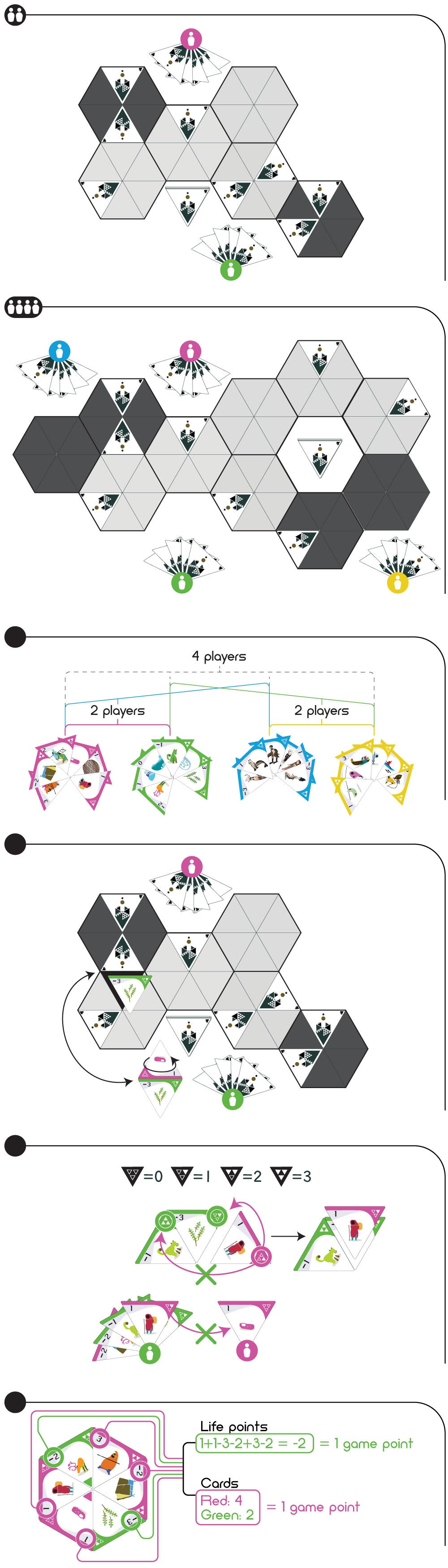 Take turns placing cards on the boards either on empty places or on upward facing cards, respecting the cards’ strength points. All cards can be played by all players.